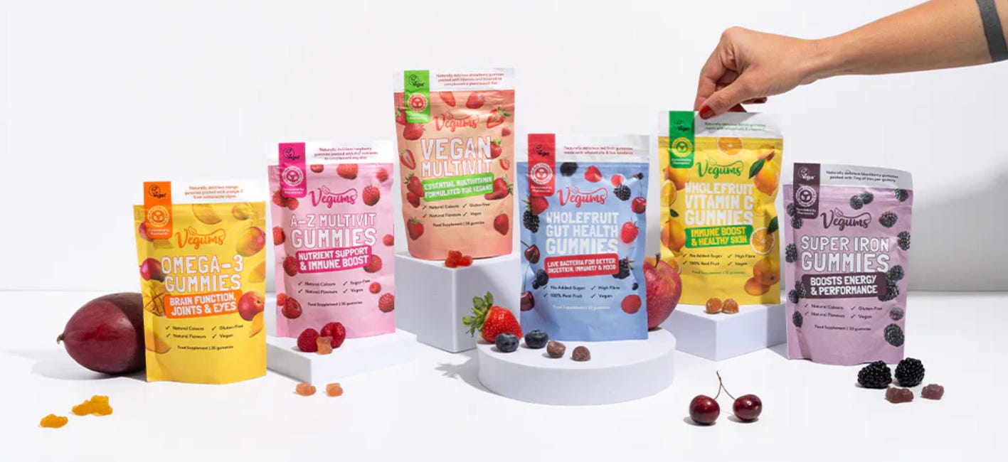 Vegums makes specifically vegan supplements in gummy form - designed for vegans who struggle to get certain nutrients (B12, iron, omega-3, vitamin D) from diet alone.